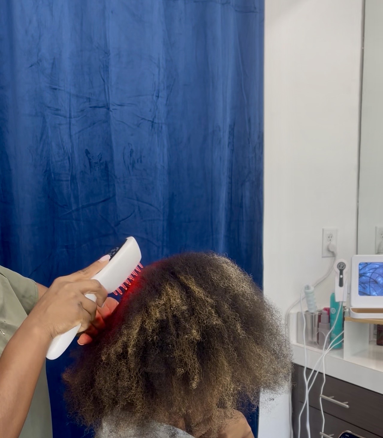 Indulge in a luxurious scalp rescue experience thoughtfully designed for clients experiencing seborrheic dermatitis. This PH balancing treatment includes a microscopic scalp scan, customized Eden detox, deep cleansing shampoo, scalp steaming, relaxing scalp massage, nourishing hair mask, hydrating conditioner, full arm and hand massage, leave-in spray, blowout, trim, warm tea, and your finished style. To further support scalp wellness and healthy hair growth, this service also includes High Frequency treatment for hair loss prevention and LED Red Light Therapy.